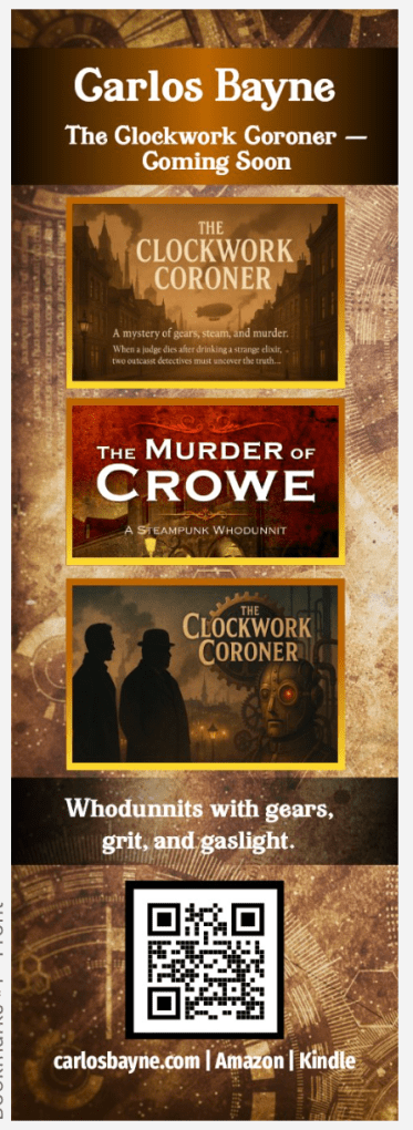 My bookmarks feature my published works — Napkin Nights and The Murder of Crowe — with a nod to my upcoming release, The Clockwork Coroner. And yes, there’s a QR code too, so anyone curious can scan, explore, and pick up a copy right away.